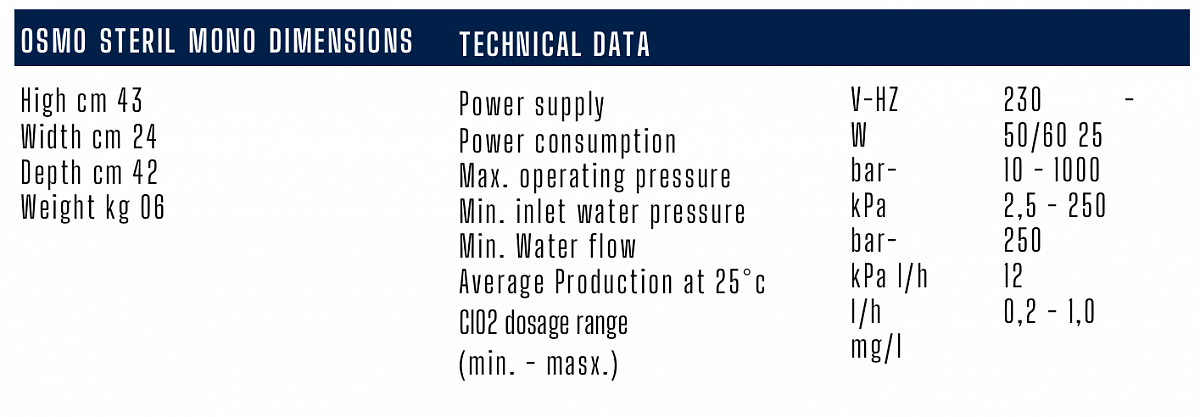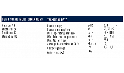 - Osmo Steril - tai vandens valymo sistema, kuri filtruoja vandenį atvirkštinės osmozės procesu, pašalindama užteršimo iš įeinančio vandens tinklo riziką ir dezinfekuoja jį stabilizuotu chloro dioksidu (BIOXTERIL®).