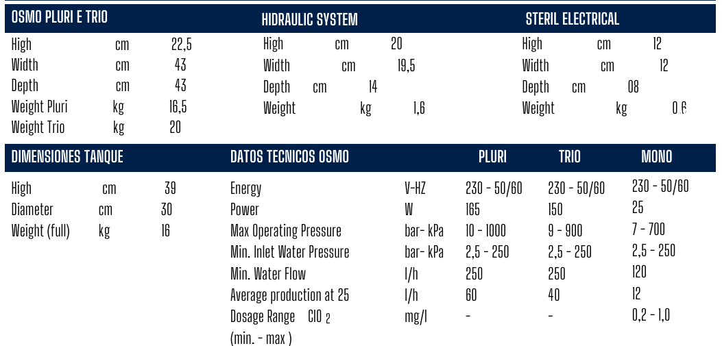 - Osmo Steril - tai vandens valymo sistema, kuri filtruoja vandenį atvirkštinės osmozės procesu, pašalindama užteršimo iš įeinančio vandens tinklo riziką ir dezinfekuoja jį stabilizuotu chloro dioksidu (BIOXTERIL®).